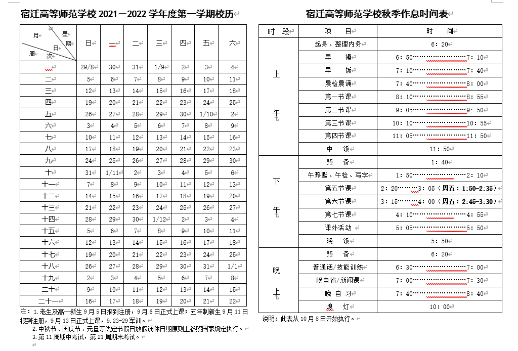 宿迁高等师范学校秋季学期作息时间表