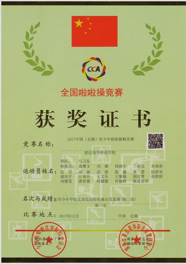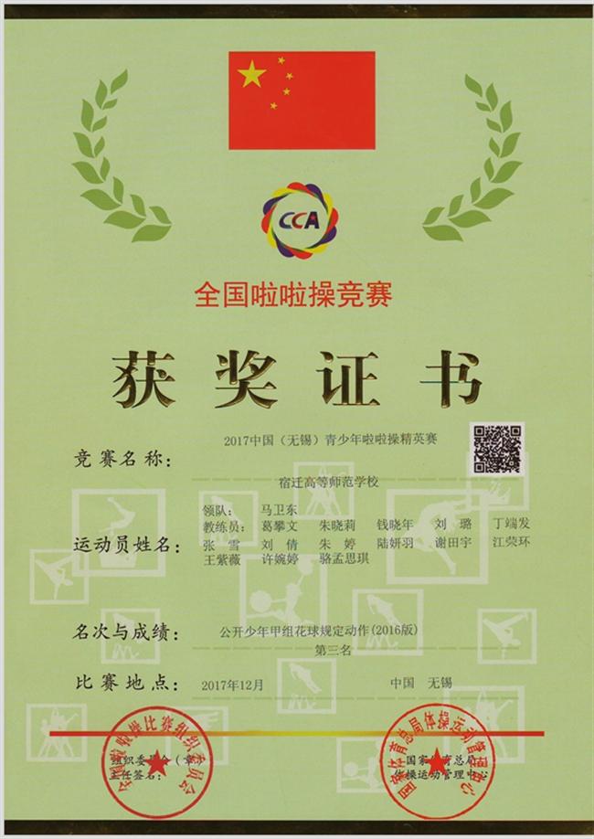 12月1日至3日,由国家体育总局体操管理中心主办,全国啦啦操委员会、江苏省社会体育管理中心、无锡市教育局等单位协办的2017中国(无锡)青少年啦啦操精英赛在江苏无锡新体育中心举办。我校取得了少年组“甲组花球示范冠军”和“花球规定季军”优异成绩。