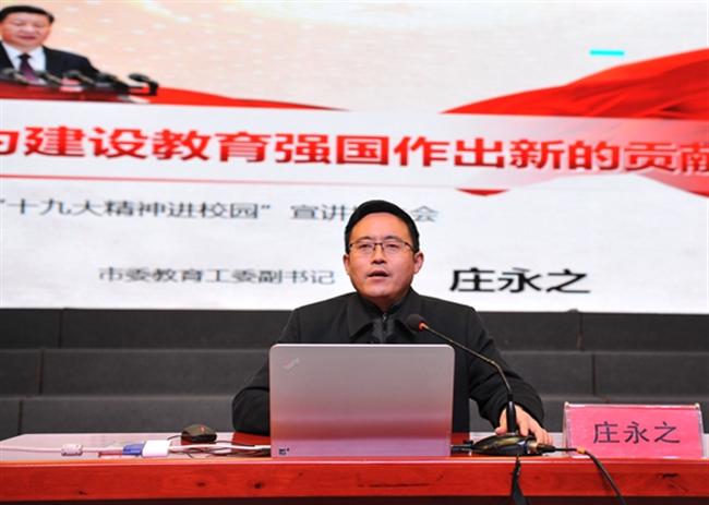 12月13日下午,市委教育工委副书记庄永之在我校礼堂为该校全体教职工、入党积极分子宣讲十九大精神,校党委书记、校长史余强主持宣讲会。全校教职工及入党积极分子聆听报告。