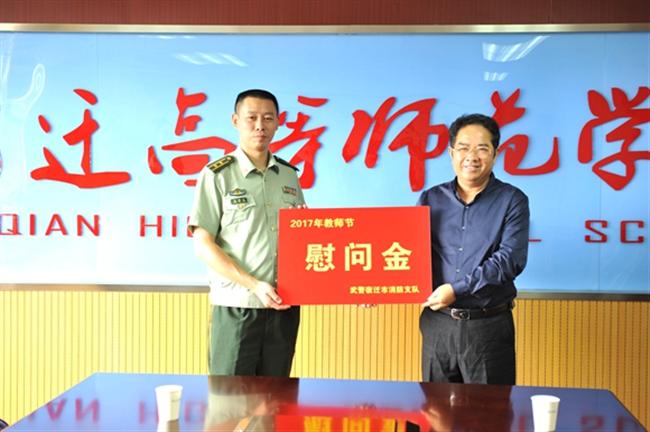 9月7日上午,武警宿迁市消防支队政治处主任张树永、司令部协管员耿磊一行到我校进行教师节慰问,为学校送来慰问金。校长、校党委书记史余强等领导热情接待了张主任一行。