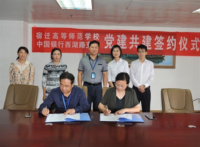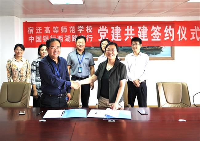 在9月20日党员活动日,校党委书记、校长史余强同中国银行宿迁西湖路支行党总支书记高晓梅分别代表双方党组织在学校综合楼713会议室签订了党建结对共建协议。