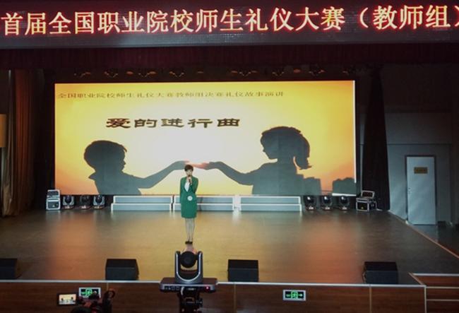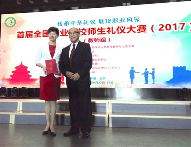 9月23日,全国首届职业院校师生礼仪大赛(教师组)在北京市昌平职业学校举办,我校宋碧老师荣获个人总分“特等奖”,国家礼宾司前司长鲁培新为其颁奖并表示祝贺。宋碧同时获得个人单项比赛礼仪知识竞赛、职业风采展示和礼仪故事演讲比赛二等奖,获得国家注册“高级礼仪培训师”职业资格证书。