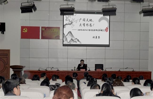 4月17日下午,原江苏省徐州财经高等职业技术学校副校长、副研究员刘景忠应邀到我校为全校教师、教干作了题为《广阔天地,大有作为》的德育讲座。校长、校党委书记史余强主持讲座。