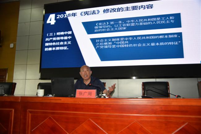 会上,张广周为大家全面讲解了《宪法》的概述、宪法的基本特征、《宪法》的发展历程、2018年《宪法》修改的背景、原则、程序、2018年《宪法》修改的主要内容以及学习宪法的重要性,使大家更加深刻地理解了修改《宪法》是时代大势所趋,是事业发展所需,是党心民心所向,充分体现党和人民的共同意志,是推进全面依法治国、推进国家治理体系和治理能力现代化的重大举措,意义重大而深远。