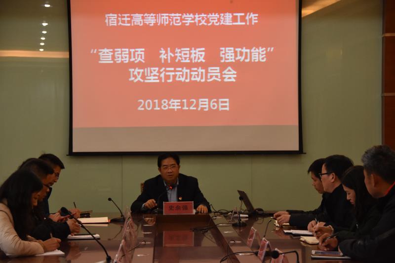 12月6日下午,宿迁高师党委召开党建工作会议,传达市委教育工委学校党建工作“查弱项,补短板,强功能”攻坚行动部署会精神,部署我校党建“查弱项,补短板,强功能”工作,全体支部书记参加会议,校党委书记、校长史余强主持会议。