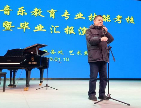 陆剑波副校长在演出前做了热情洋溢讲话,充分肯定本次活动的创新之处和重要意义,赞扬了指导教师五年来的辛勤教育,充分肯定了同学们不怕严寒刻苦训练的精神。同时希望艺术系把舞台和讲台的技能训练和考核充分融入到人才培养中,不断提高学校人才培养质量。
