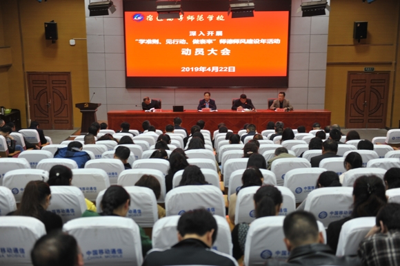 为全面贯彻落实市教育局《关于深入开展“学准则、见行动、做表率”师德师风建设年活动的实施方案》(宿教发[2019]17号)文件精神,进一步加强学校师德师风建设,4月22日下午,校党委在教职工月例会上召开深入开展“学准则、见行动、做表率”师德师风建设年活动动员会,全校教职工在校综合楼三楼东会议室参加会议,校党委书记、校长史余强主持会议并开设了《解读<新时代教师职业行为十项准则>》专题讲座。
