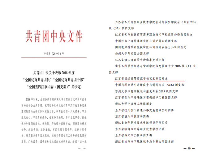 五四青年节之际,共青团中央发布《共青团中央关于表彰2018年度“全国优秀共青团员”“全国优秀共青团干部”“全国五四红旗团委(团支部)”的决定》(中青发〔2019〕6号),我校艺术系团总支荣获“全国五四红旗团支部”荣誉称号。