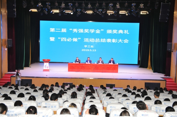 5月13日下午,我校在校礼堂隆重举行第二届“秀强奖学金”颁奖典礼暨“四必做”活动总结表彰大会。“秀强奖学金”捐赠人、江苏秀强玻璃工艺股份有限公司董事长、总经理卢秀强、校党委书记、校长史余强分别在大会上讲话。江苏秀强玻璃工艺股份有限公司党委副书记、副总经理蔡华伟宣读了第二届“秀强奖学金”获得者和“四必做”活动先进个人、先进班级名单;校党委委员、副校长张彦芝主持活动。与会领导向奖学金获得者代表颁发奖金和证书并与获奖学生合影留念。学校各部门负责人和700余名学生代表参加典礼。