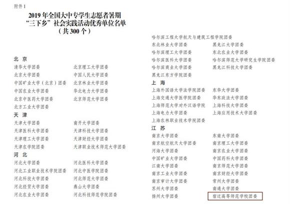 据悉,为庆祝新中国成立70周年、五四运动100周年,团中央以“青春心向党.建功新时代”为主题,面向全国各大中专院校,组织了全国、省级、校级、院系级10万支重点实践团队、800万人次青年学生参加了此项活动,活动通过理论宣讲、科技支农、教育帮扶、文化宣传、生态环保等形式,有力推动了习近平新时代中国特色社会主义思想的学习宣传、脱贫攻坚和乡村振兴。校团委积极组织团干和广大青年参加学习宣传及礼仪服务等各项志愿者活动,有力加强了共青团建设,展示了宿迁人民良好的对外形象,获得了社会广泛赞誉。