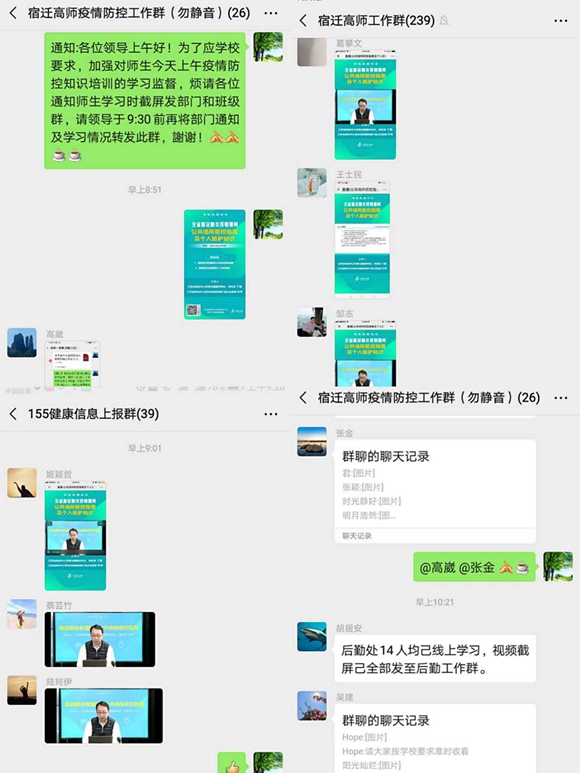 学校及时在微信群下发了活动通知,明确了学习要求。全校师生员工准时参加网上培训,及时把学习场景截图发到各系部处室及班级微信群中。学校纪委对此次学习活动全程全员开展督查,表扬了组织较好部门,对组织不力的个别部门进行了提醒,充分发挥了防疫监督保障作用。