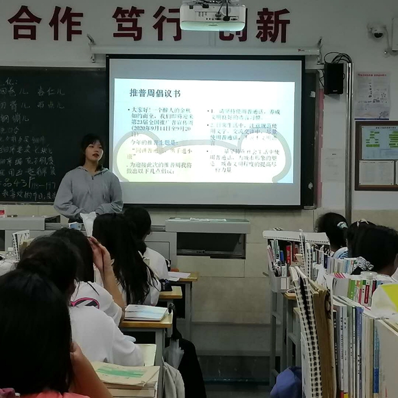三是积极组织系列活动。学校召开了教研室主任推普专题会议,开展了课堂教学使用普通话自查和检查。健全了各班推普委员和推普群,加强网格化推普工作。开展了全校性经典诗文视频诵读比赛,在提升学生普通话表达能力的同时,培养学生爱国主义情怀,加强优秀传统文化传承。组织学生进行了规范字书写比赛,提高学生规范汉字书写水平。各班级围绕活动主题组织学生收看推普周宣传视频。
