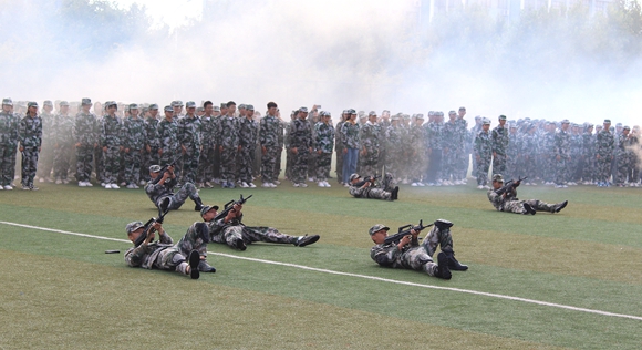 同时,结合烈士纪念日“铭记丰功伟绩 传扬英烈精神”和国庆节 “我和我的祖国”宣传教育,该校还安排了“手握钢枪祭先烈,枪林弹雨忆峥嵘”战术表演,激情澎湃的作战任务演练赢得了阵阵掌声。“我和我的祖国,一刻也不能分割。无论我走到哪里,都流出一首赞歌……”最后,全体师生同唱《我和我的祖国》,用歌声表达对伟大祖国的热爱与祝福。