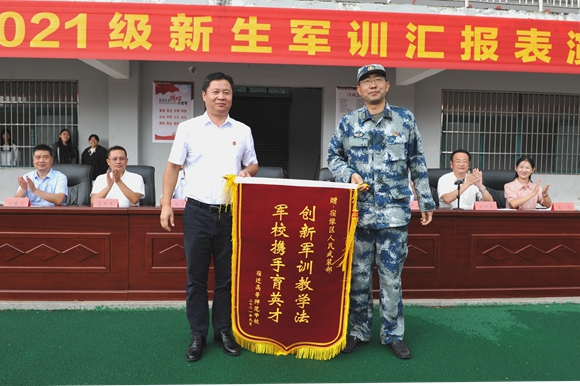 在此次军训中,全体教官以坚定的政治信念、出色的组织能力、严明的组织纪律和过硬的军事素质,展示了人民子弟兵文明之师、威武之师的良好形象。宿迁高师党委书记、校长韩勇代表校党委、校长室和全体师生,向长期以来支持该校军训工作的宿豫区人武部、向在军训工作中付出辛勤劳动的全体教官表示崇高的敬意。“军训汇报表演,既是结束,也是开始,未来高师的学习生活会更加绚丽多彩。”他希望2021级全体新生要学会“自我管理、自主学习”、做到“刚健有为、自强不息”、坚持“学以致用、知行合一”,以青春的激情书写自己的高师梦,以青春的斗志创造自己的精彩人生,努力做一名爱国、励志、求真、力行的新时代奋斗者。