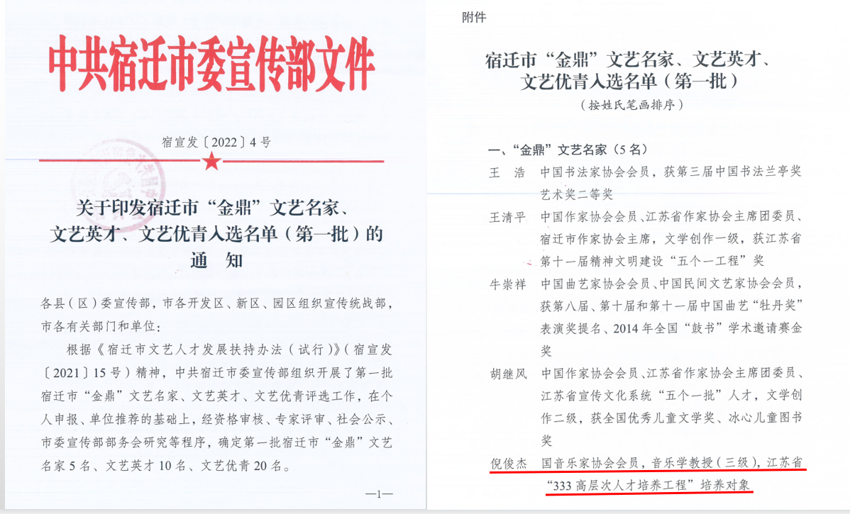 根据《宿迁市文艺人才发展扶持办法(试行)》(宿宣发〔2021〕15号)精神,市委宣传部组织开展了第一批宿迁市“金鼎”文艺名家、文艺英才、文艺优青评选工作,我校倪俊杰教授被确定为第一批宿迁市“金鼎”文艺名家。