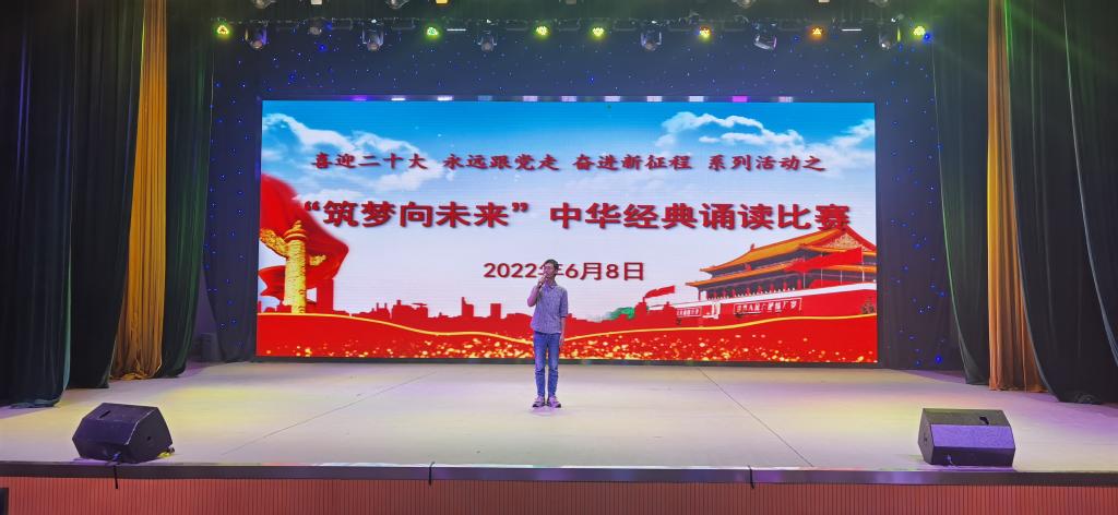 6月8日下午,我校在礼堂举办“喜迎二十大,永远跟党走,奋进新征程”系列活动之“筑梦向未来”中华经典诵读比赛。科研处处长徐龙、学工处处长陆伟、学工处副处长葛鹏、团委屈娇娇老师、语文组鲁天智老师担任评委,全校五个系共16名选手参与比赛。