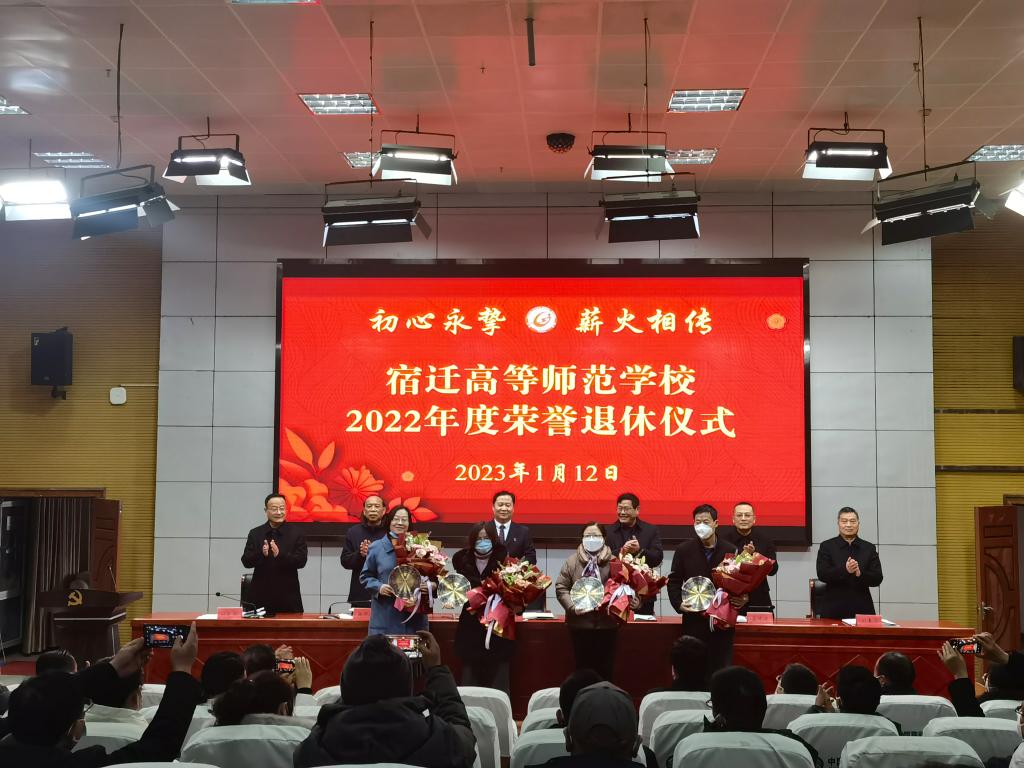 为深入推进“四度”校园建设,努力打造一所人文关怀有温度的温馨校园,切实增强广大教职工的荣誉感、归属感和幸福感,激励退休老同志退休不褪色、离岗不离心,1月12日,宿迁高等师范学校举行2022年度教职工荣誉退休仪式。校党委书记、校长韩勇等领导班子成员及全体教职工参加仪式,共同欢送史余强、王海宁、虞军、朱丽丽、高飞5位同志光荣退休,党委委员、副校长张彦芝主持退休仪式。