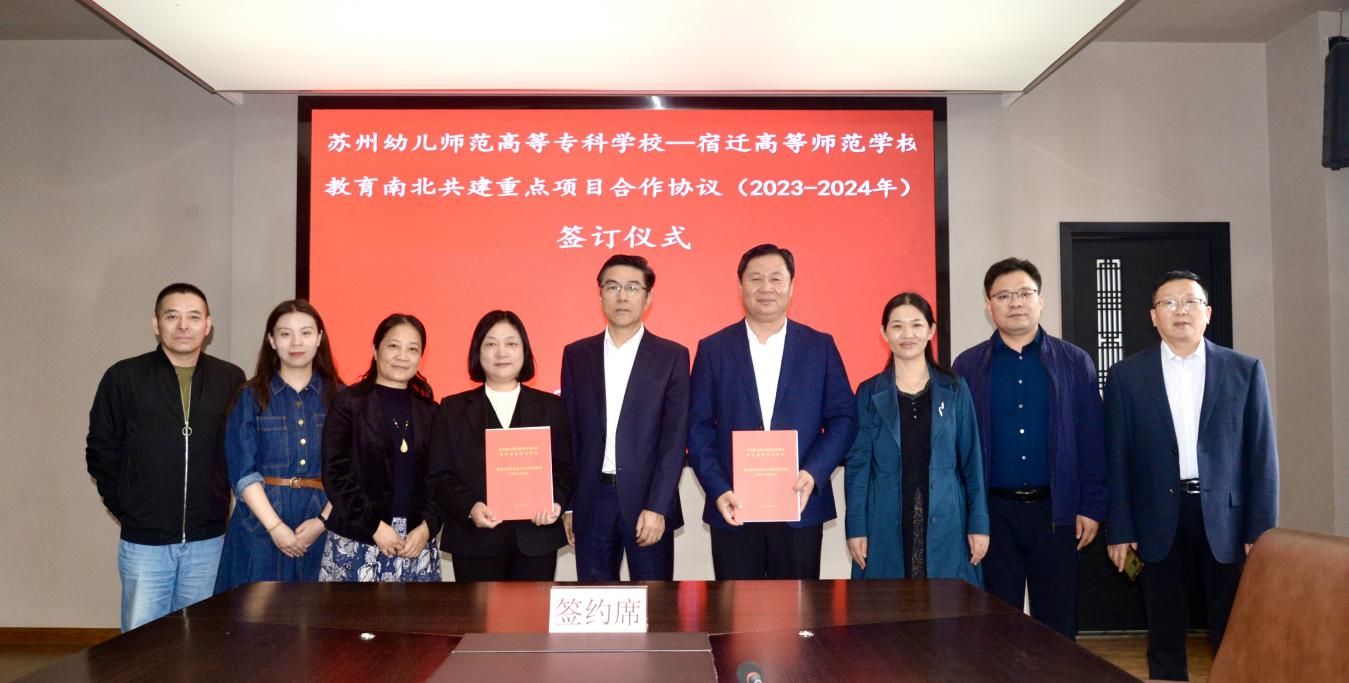 为进一步深化和拓展苏州、宿迁两市教育南北共建合作,10月20日,宿迁高等师范学校与苏州幼儿师范高等专科学校教育南北共建重点项目合作签约仪式在苏州幼儿师范高等专科学校照怀楼第二会议室举行。苏州幼儿师范高等专科学校党委书记杨建良,党委副书记、校长殷海芳,党委委员、副校长吕虹,我校党委书记、校长韩勇,党委副书记葛井井,党委委员、人事处处长高凯以及两校有关部门负责人出席仪式。