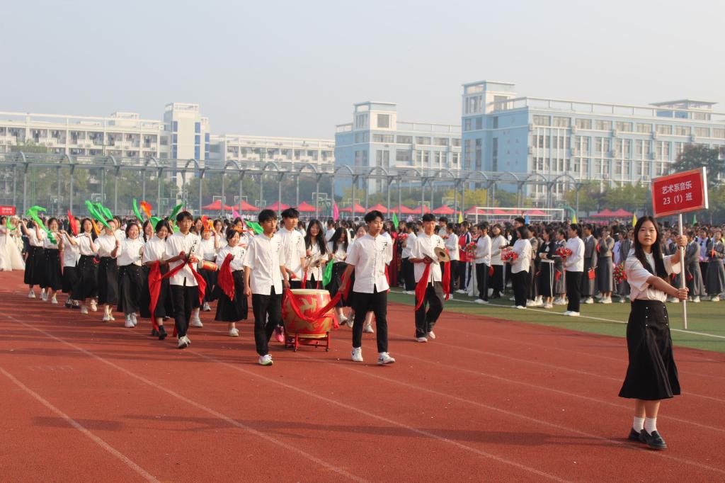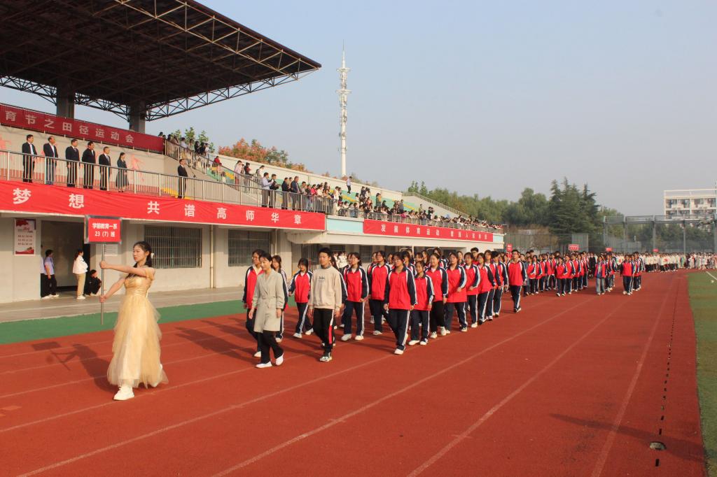 开幕式上,国旗方阵、鲜花方阵、彩旗方阵、各班级的运动员代表方阵,迈着整齐有力的步伐依次经过主席台,展现了高师学子昂扬向上的精神风貌。而啦啦操、大型歌舞等展示成为开幕式上的一大亮点,同学们整齐的动作、个性的着装、充满创意的呈现方式,诠释了高师学子的凝聚力和创造力,展示了新时代青年学子的热情和才华。