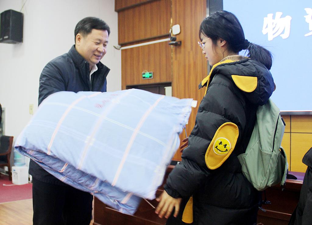 为贯彻落实省、市有关开展“暖心工程”的文件精神,12月18日下午,我校在二号楼学术报告厅举行“暖心工程”物资发放仪式,校党委书记、校长韩勇出席仪式并为100名家庭经济困难学生发放垫被。仪式上,校党委委员、副校长刘芝兵发表讲话,学工处处长马卫东主持仪式。