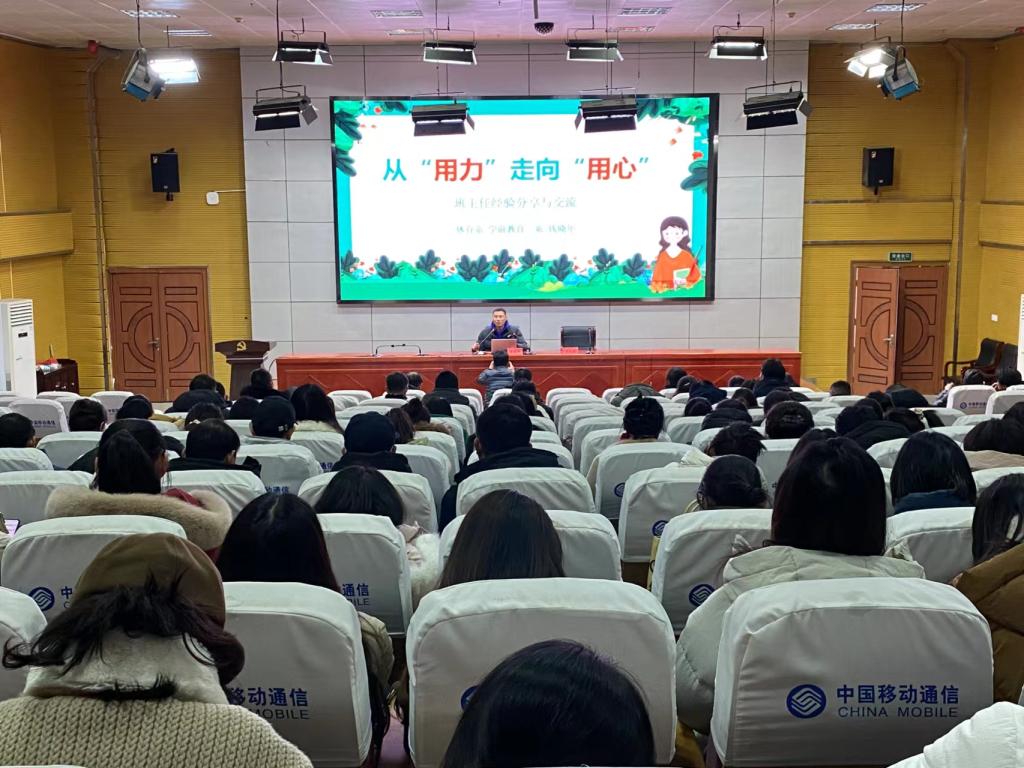 钱晓年老师以从《“用力”走向“用心”》为题,从班主任的多重角色入题,结合自身班级管理经验,分析了班主任需要做什么?班主任的“苦”和“甜”有哪些?围绕我眼中的班主任角色,聚焦带班理念,重点就“进门要三看、课间要三听、闲时要三动、不会要三学”分享了班级管理“三字经”,就做到“勤”“严”“四心”阐述了做智慧班主任的心得体会,直面学校班级管理问题并给出了切实可行的改进举措,博得了与会教师的阵阵掌声。