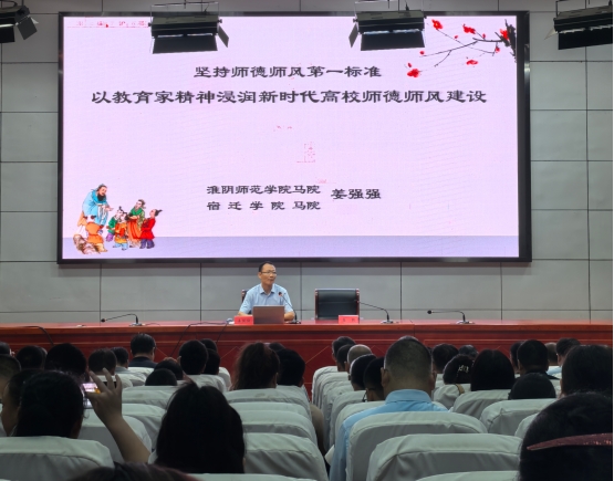 开训第一讲,淮阴师范学院马克思主义学院院长姜强强作《坚持师德师风建设第一标准 以教育家精神浸润新时代高校师德师风建设》专题报告。姜院长从东西方“德”“法”的重要性入题,系统梳理了中华优秀传统文化中的师道、师德,重点解读了习近平总书记关于师德建设的重要论述;围绕近年来我国高校师德师风建设要求,深度剖析了当前加强高校师德师风建设的重要性与紧迫性,对新时代加强高校师德师风建设提出了明确思路和中肯建议,让与会教职工深受启发。