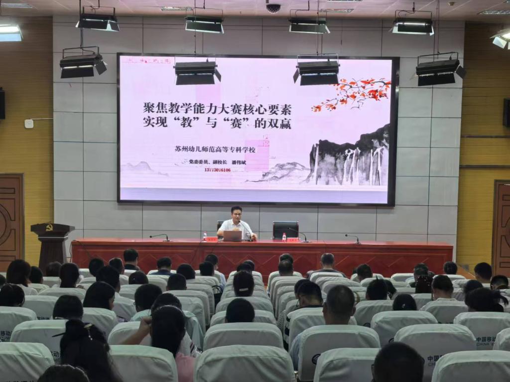 苏州幼专潘伟斌副校长以《聚焦教学能力大赛核心要素 实现“教”与“赛”的双赢》为题,结合自身工作经验,权威解读了教师教学能力大赛重点关注的五个维度,细致剖析了评审专家重点关注的九大内容,结合优秀案例,从如何选题、如何做好教学设计、如何撰写教学实施报告等方面为我校教师参赛指点迷津、传经送宝。