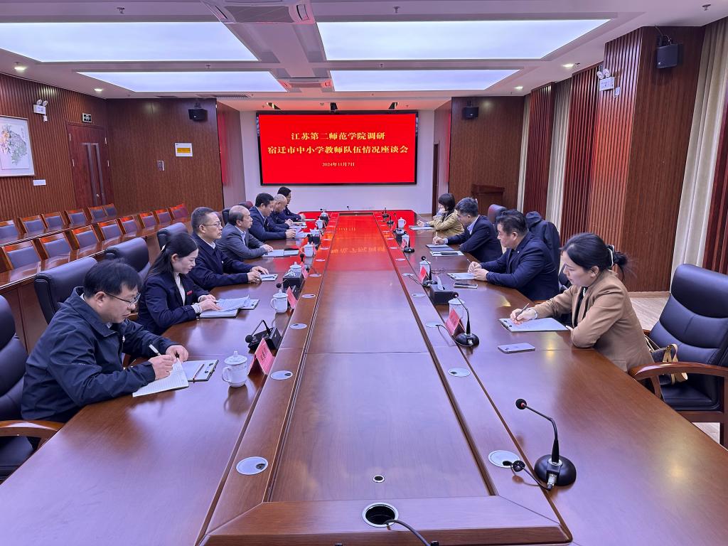 2024年11月7日下午,江苏第二师范学院莅宿调研全市中小学教师队伍建设情况座谈会在我校举行。江苏第二师范学院校长徐国华,市教育局副局长马祥云,校党委书记、校长韩勇,江苏第二师范学院继续教育学院院长陈国庆,校领导班子成员葛井井、高凯,市教育局教师工作处处长夏伟以及学校培训中心负责人等参加座谈会。