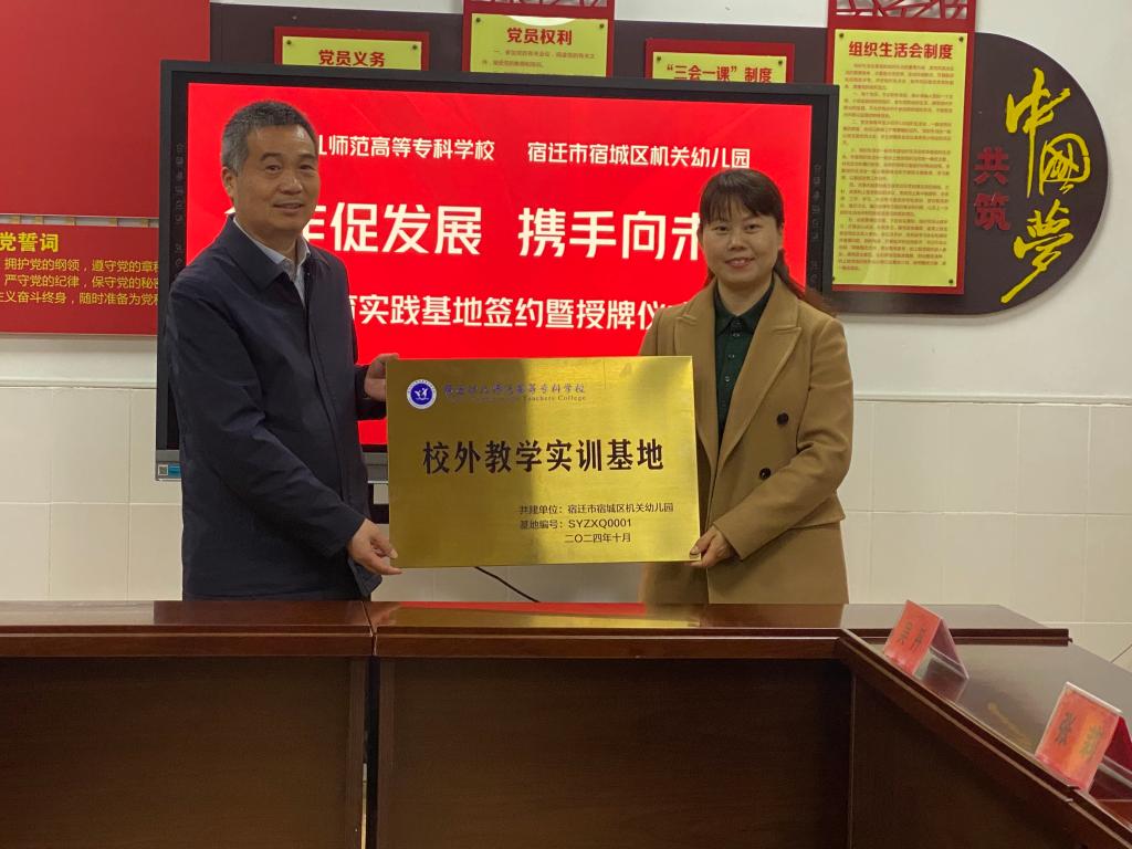 11月14日,我校学前教育学院与宿城区机关幼儿园签署合作协议。校党委委员、副校长刘春水,学前教育学院院长许乃跃,院党支部书记张颖率学院部分教师代表,宿城区机关幼教集团园长吕英、副园长王晓玲、张莉、徐冬梅参与了本次活动。刘春水副校长与吕英园长代表双方签署协议,并为校外教育实训基地揭牌。该园副园长吴丹主持仪式。