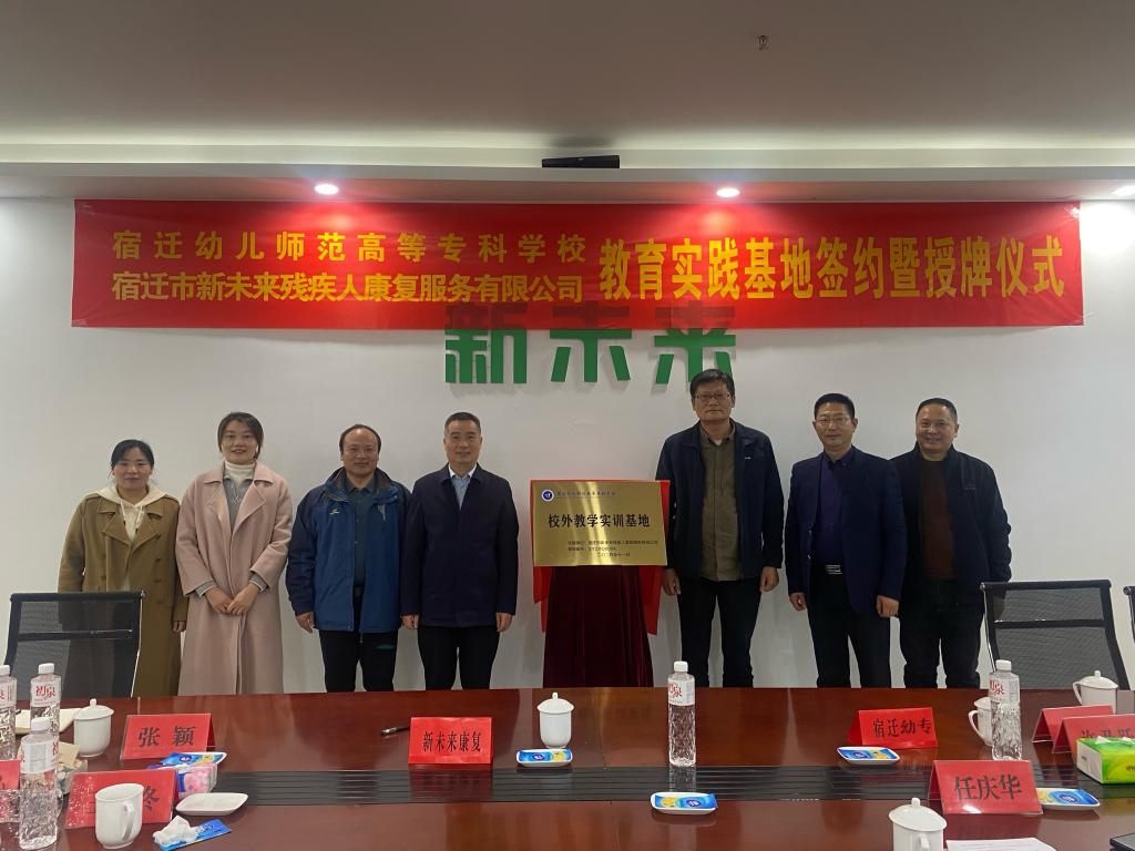 签约仪式上,双方签署合作协议,并为校外教育实训基地揭牌。副校长刘春水对该公司推动教学实训基地建设以及提供实习实践机会表示感谢。他指出,新未来残疾人康复服务有限公司是全国孤独症岗位实操培训合作单位,是全省“康复定点机构规范提升”首批合格单位,近4年来,公司为208名特殊儿童成功“脱帽”走进正常幼儿园和小学,是宿迁地区不可或缺的特殊教育的中坚力量。而我校作为宿迁市唯一一所培养幼儿园和小学师资的公办专科学校,肩负着为宿迁培养高水平教育人才的使命。双方达成合作是一次重要的契机,为幼教和特教人才培养探索提供了新的方向。他表示,我校将选派优秀的实习生和专业教师前往公司实习实训,接下来在人才培养、课题研究、师资培训等方面将进一步深化合作。