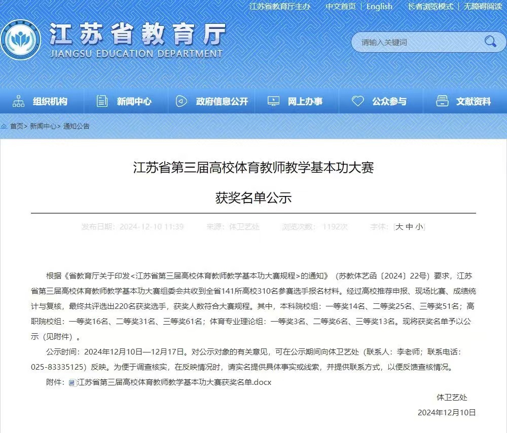 2024年11月20日至24日,由江苏省教育厅主办,江苏省学校体育教学指导委员会、南京工业大学和南京信息职业技术学院共同承办的江苏省第三届高校体育教师教学基本功大赛隆重举行。其中,高职院校组比赛于11月22日至24日在南京信息职业技术学院展开,全省78所高职院校的151名体育教师踊跃参赛。