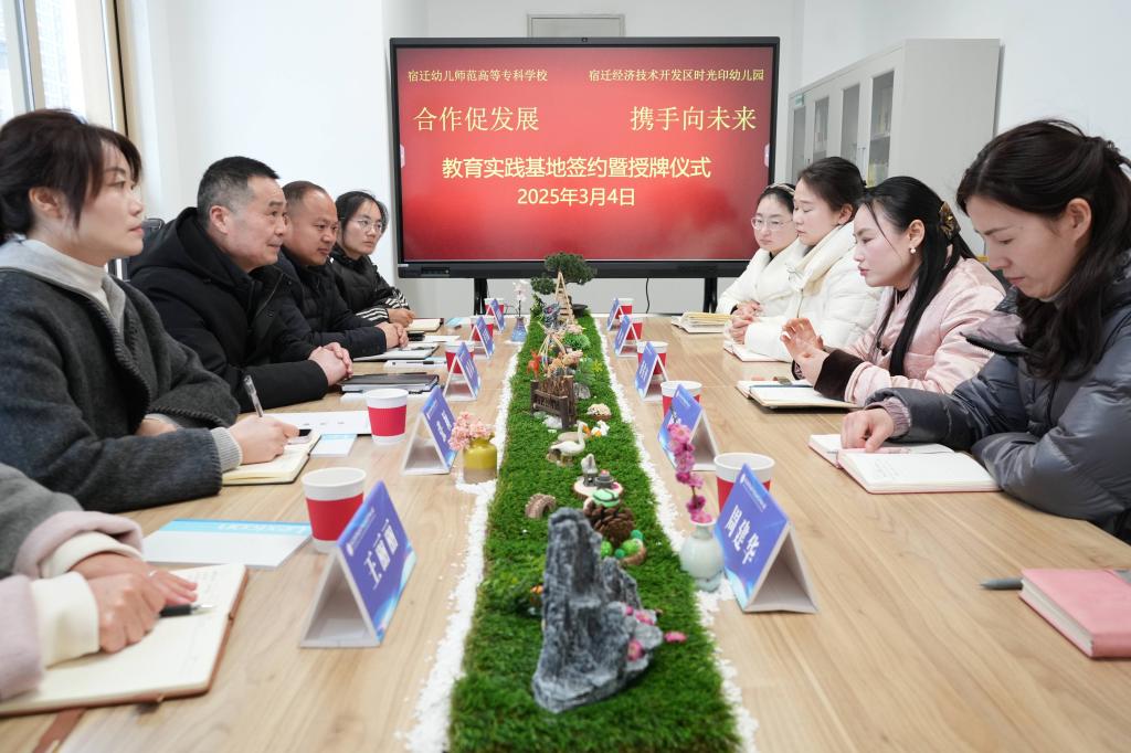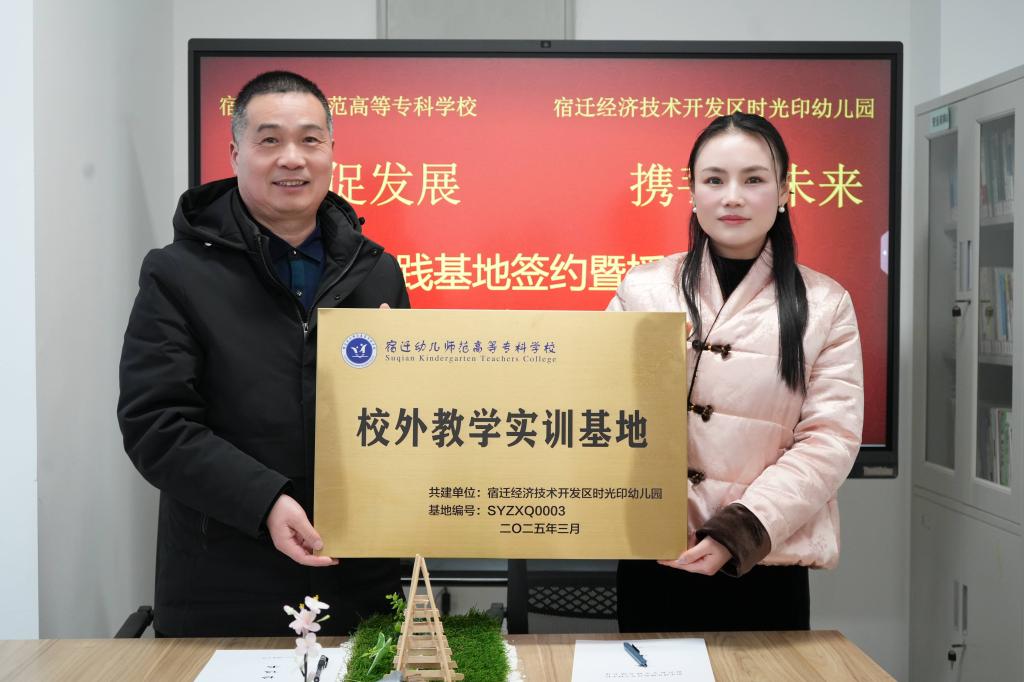 3月4日,宿迁幼专学前教育学院与宿迁经济技术开发区时光印幼儿园战略合作签约暨教育实训基地揭牌仪式成功举行。校党委委员、副校长刘春水,经开区时光印幼儿园园长蔡佐好代表双方签署协议并共同为基地揭牌。