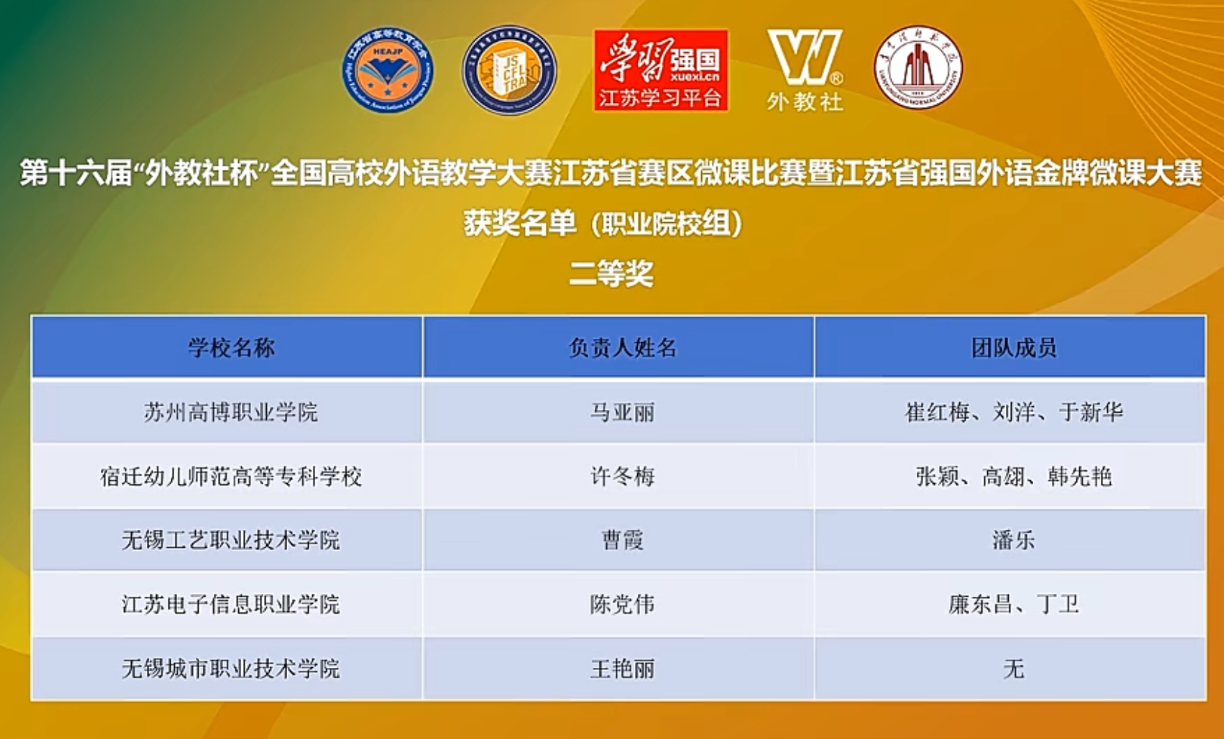 近日,第十六届“外教社杯”全国高校外语教学大赛江苏省赛区微课比赛暨江苏省强国外语金牌微课大赛圆满落幕,我校基础教育部英语教师团队凭借出色的表现荣获职业院校组二等奖,为学校争得了荣誉。此次获奖的英语教师团队由许冬梅、张颖、高翃、韩先艳四位教师组成。她们精心打造的微课作品“The Chinese Dream”,凭借独特的设计思路、明确的教学目标以及精彩的教学呈现,在众多参赛作品中脱颖而出。