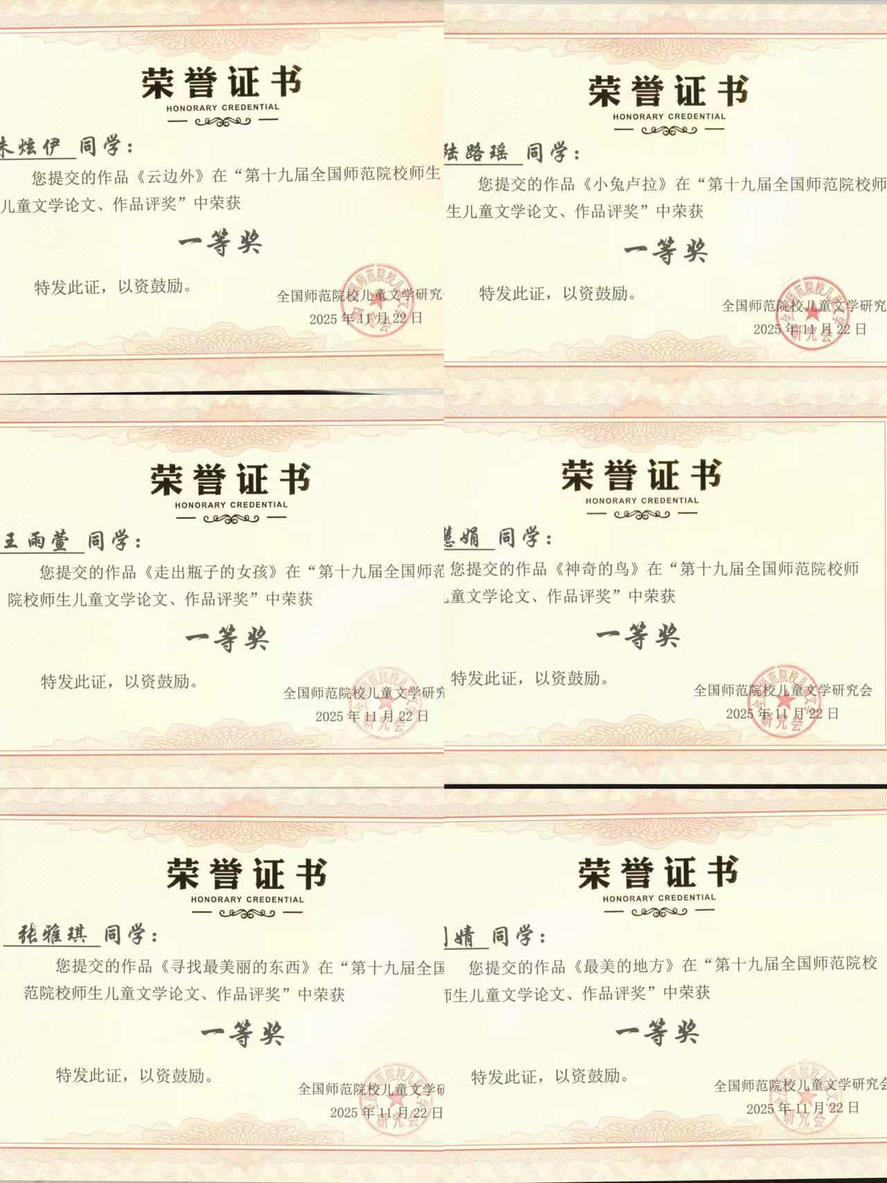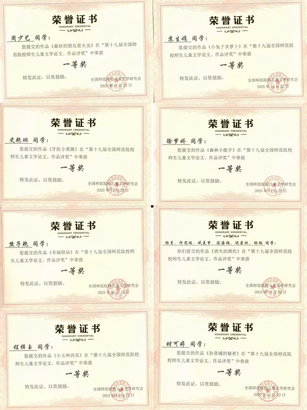 在日前结束的全国师范院校儿童文学第19届年会论文、作品评选中,我校王欣美老师论文《岗课赛证创研:儿童文学体验式教学实践探索》获教师组论文评选二等奖;我校学前教育学院学生朱炫伊、陆路瑶、王雨萱、张慧娟、张雅琪、周婧、时可婷、徐梦娇、苏生娟、程梓玉、熊子艳、史艳琳、周少艺、杨月等同学获一等奖;王欣美老师获优秀指导老师奖,我校获优秀组织奖。