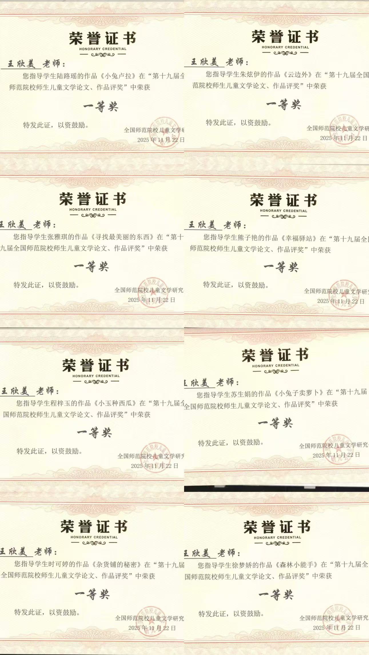 本次获奖是对我校教学成果和学前教育创新人才培养的肯定,显示了我校儿童文学社团创意写作的实绩,也是王欣美老师主持的江苏高校哲学社会科学研究项目《基于“岗课赛证创研”融通育人的儿童文学体验式教学研究》(编号:2025SJYB1774)、宿迁市教育科学课题《“岗课赛证 ”融通视域下的儿童文学体验式教学研究》(编号:SQ2024GHZD021)、江苏省高等教育教学改革研究课题《人工智能赋能幼儿师范儿童文学体验式教学研究》(编号:2025JGYB682)的阶段性成果,对于推动我校专业品牌建设、书香校园建设具有积极意义。