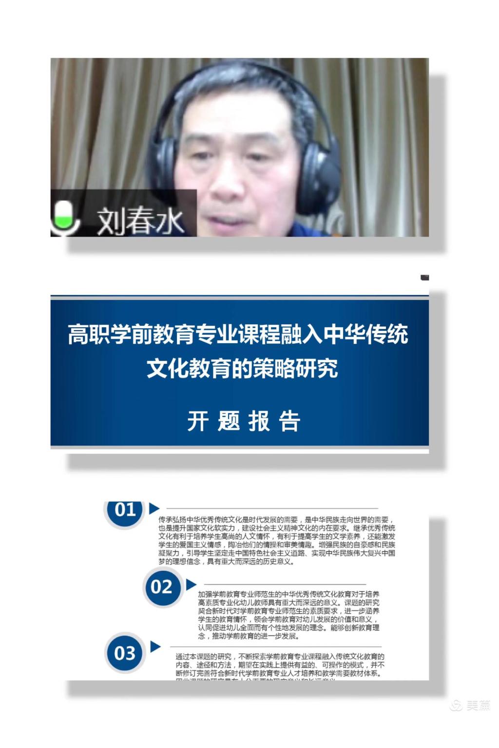 2022年4月1日下午,由我校刘春水同志申报的中国学前教育研究会“十四五”研究课题《高职学前教育专业课程融入中华传统文化教育的策略研究》的开题论证会在腾讯会议线上进行。南通大学钱慧博士、江苏省陈鹤琴研究会华希颖博士、南通市教育科学研究院陈爱萍老师、如东教师发展中心唐海燕特级、南通师范第二附属小学幼儿园邵敏园长等作为论证专家参加了论证会。活动由南通市教育科学研究院承办,如皋市吴窑镇教育管理中心学前教育辅导员郝霞主持了论证会。