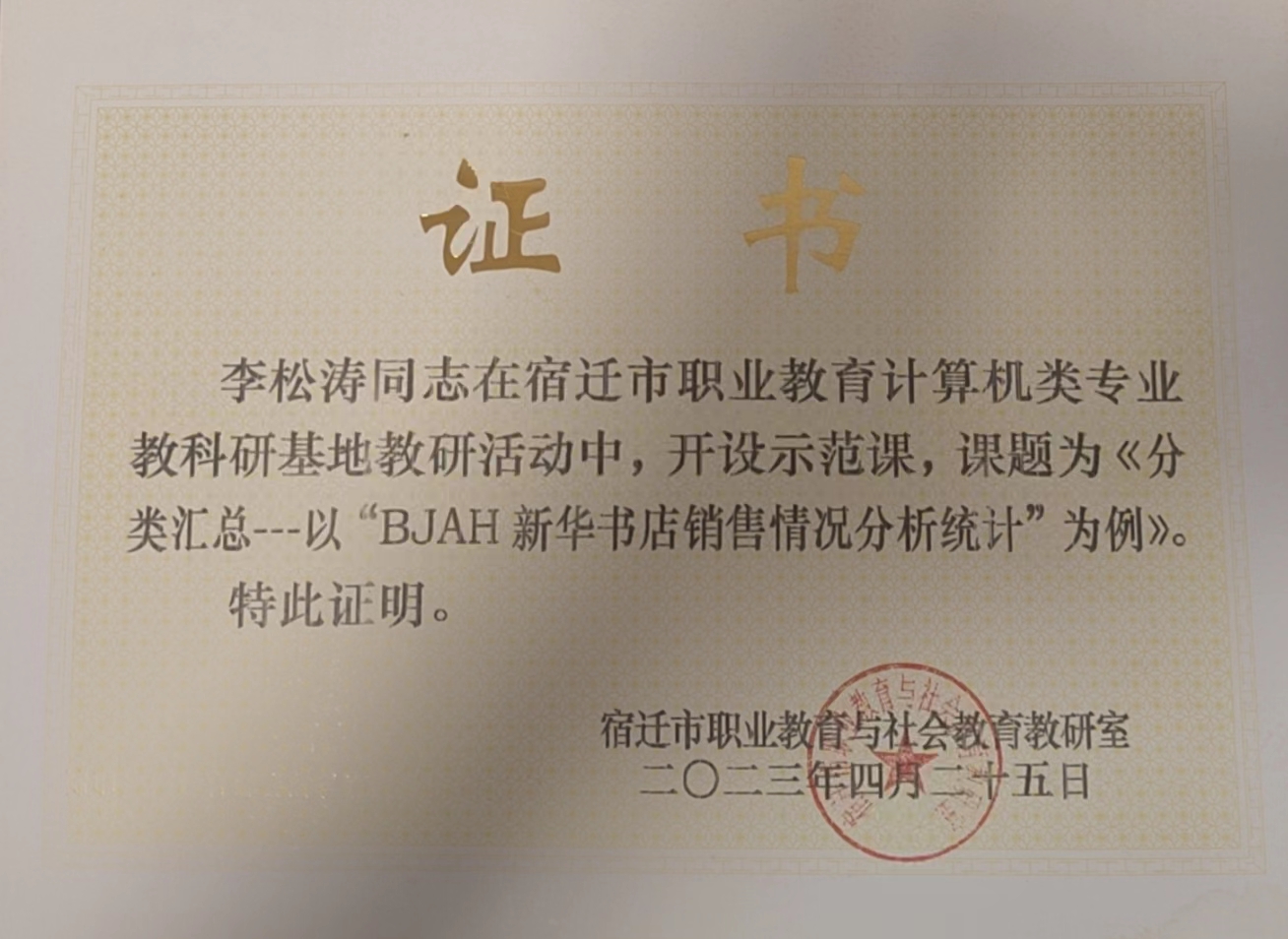 2023年4月25日上午第二节,李松涛老师在宿迁市职业教育计算机类专业教科研基地教研活动中,开设示范课。市职业教育计算机类专业教研室全体成员参与了听课。