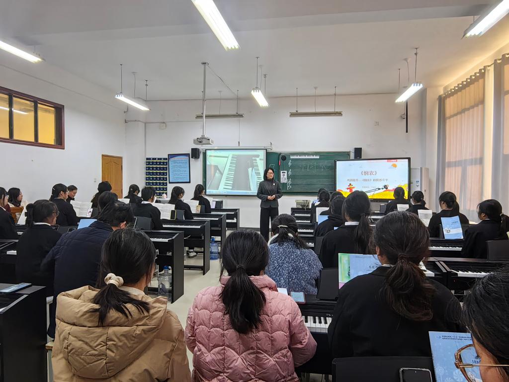 2024年11月27日下午第三节,宋晓英老师在数码钢琴227教室开设江苏省陶行知研究会“十四五”规划课题成果交流课,开设课程的题目是儿歌弹唱《悯农》,授课对象是学前教育专业2021级(8)班学生。宋晓英老师课题组成员、艺术学院部分音乐教师、我校部分教学人员参与了听课活动。