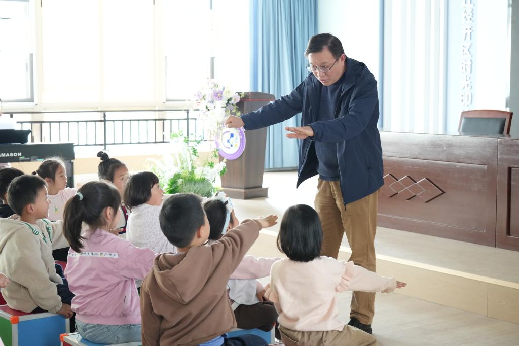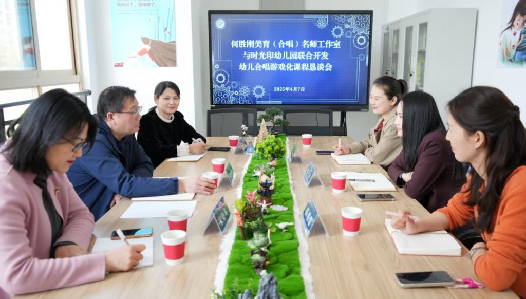春风浩荡,四月芳菲。4 月 7 日下午,何胜刚美育(合唱)名师工作室部分成员在工作室主持人何胜刚老师带领下赴宿迁市经济开发区时光印幼儿园,就合作开发幼儿合唱游戏化课程进行观摩、调研、商谈。时光印幼儿园园长蔡佐好热情接待了工作室成员一行,室、园双方进行了深入、诚恳的商谈,基本达成了合作开发幼儿合唱游戏化课程的共识,初步会商出合作开发的举措。