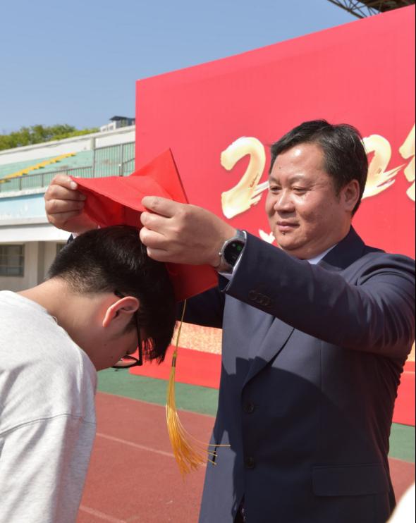成人礼的加冠赠礼环节,充满了庄重与期待。师长们亲手为学子戴上成人礼帽,并轻轻拨动帽穗。每一顶礼帽都承载着 “今日我育桃李,明日你筑山河” 的深切期望,而帽穗的轻扬,也象征着学子们对未来许下的郑重承诺。