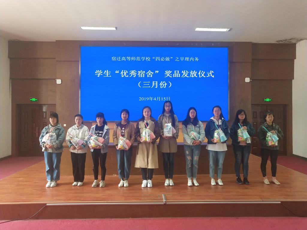 四月十五日下午,我校于二号楼学术报告厅举行“四必做”之早理内务三月份“优秀宿舍”奖品发放仪式。工处陆伟副处长主持仪式并为由获奖的21名宿舍代表颁奖。