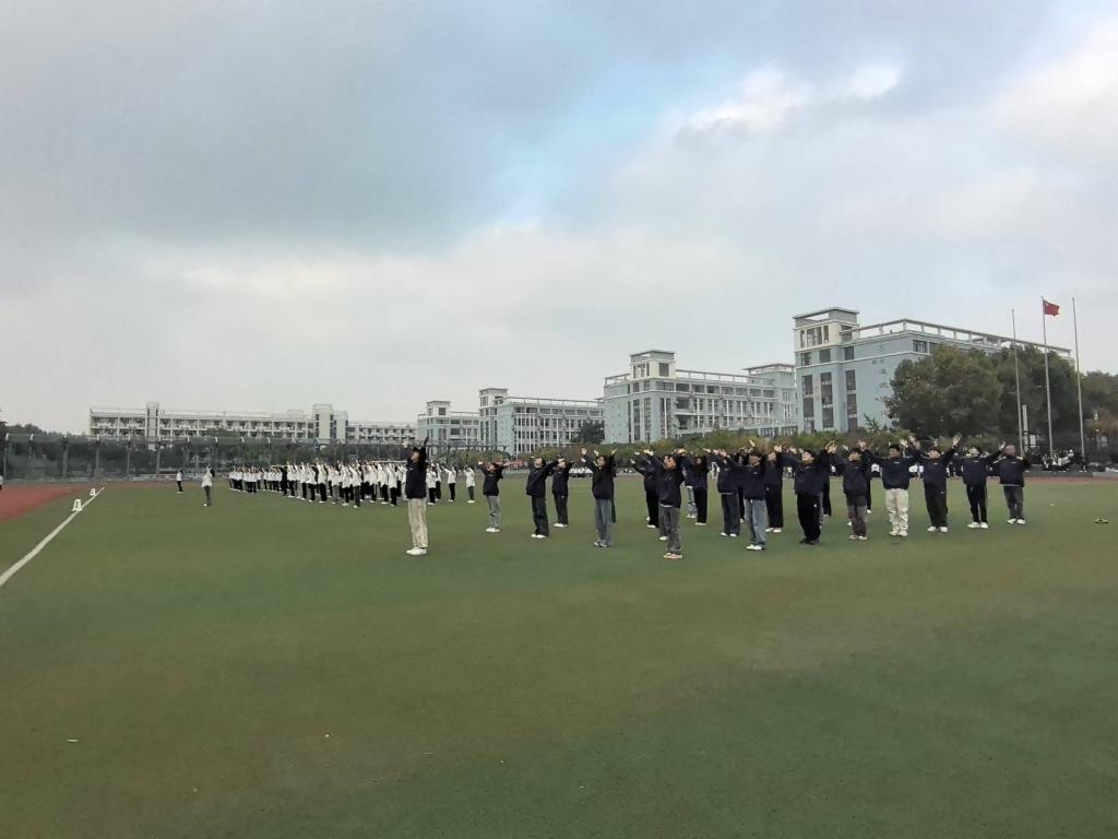 随着广播操音乐的响起,同学们迅速调整状态,全神贯注地投入到比赛中。伸展、扩胸、踢腿、体转……每一个动作都规范标准,整齐划一。他们的眼神中透露出坚定与自信,仿佛在向所有人展示着自己的青春风采。