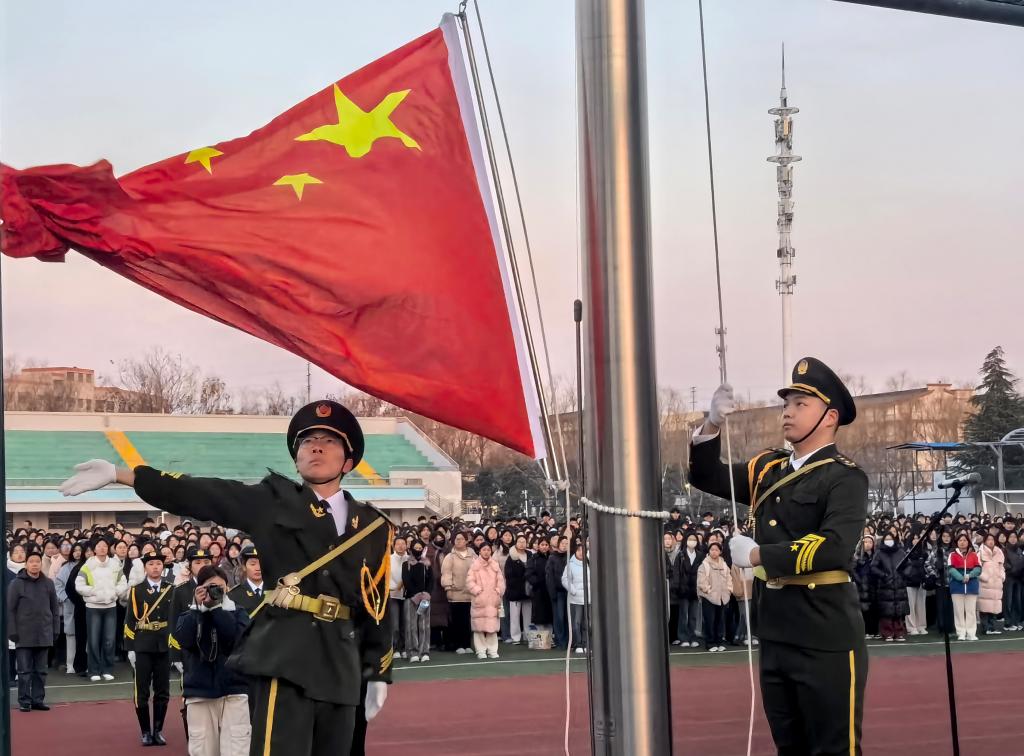 升旗仪式由学生工作处处长马卫东主持。在庄严的国歌声中,五星红旗冉冉升起,全体师生肃立,向国旗行注目礼,表达对祖国的崇高敬意。