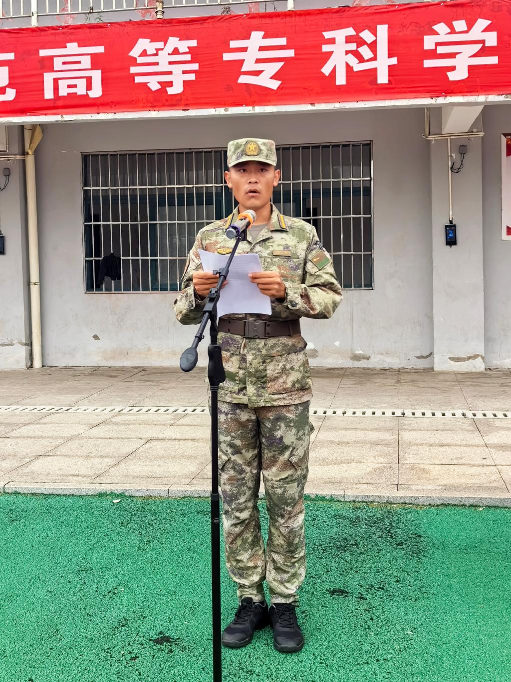 军训教官代表马驰同志代表全体教官郑重承诺,将以严谨之姿、专业之范开展训练,既严格要求、科学施训,助力学生掌握军事技能,亦会主动关怀、耐心引导,确保军训任务安全有序开展,让同学们在训练中收获成长、实现蜕变,传承军人的坚韧品格。