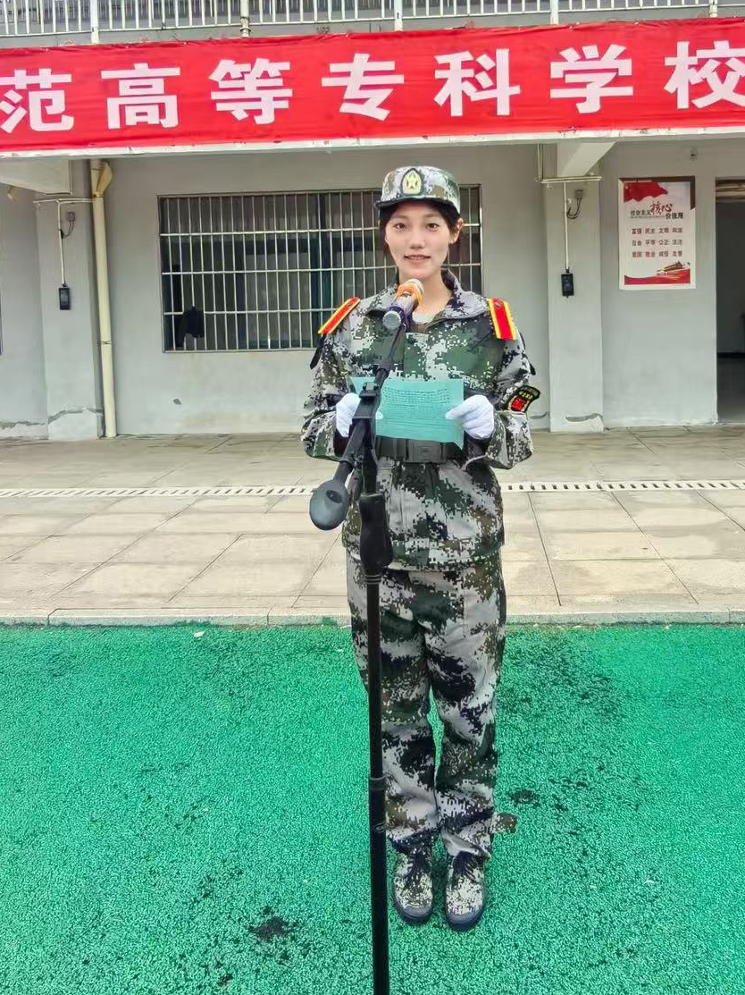大会严格遵循议程有序推进,现场秩序井然,学生们身着整齐着装,以饱满的精神状态迎接军训挑战。2025 级新生代表、艺术学院美术教育25(1)班傅镡弘同学率先发言。她以新生的身份,满怀期待地分享了对大学生活的憧憬,并郑重表态:“将以最昂扬的斗志投入军训,严守纪律、刻苦训练,在汗水中磨练意志,在协作中凝聚力量,把军人的优良作风融入未来的专业学习与成长,努力成为有担当、能吃苦的幼儿师范学子。” 真挚的发言赢得现场阵阵掌声,也点燃了新生们的参训热情。