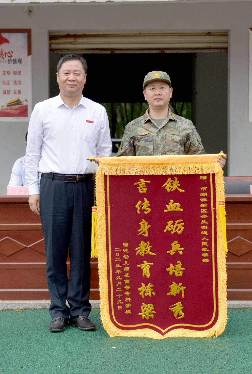 最后,大会举行赠旗仪式。为感谢井头街道人武部对学校军训工作的鼎力支持,韩校长向井头街道人武部赠送锦旗,锦旗上凝结着学校对承训单位的诚挚谢意,也见证了军民之间的深厚情谊。