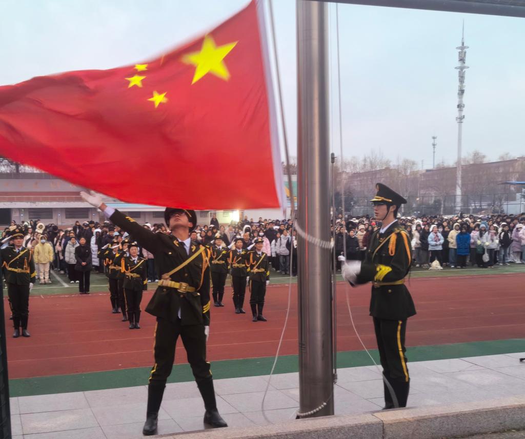 伴随着激昂雄壮的《义勇军进行曲》,鲜艳的五星红旗冉冉升起、迎风飘扬。全体师生肃立注目,高唱国歌,浓浓的爱国情怀与奋进之志在校园中激荡。