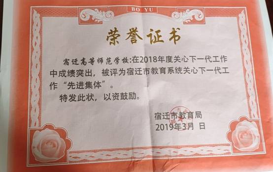 祝贺宿迁高师荣获“宿迁市教育系统关心下一代工作先进集体”