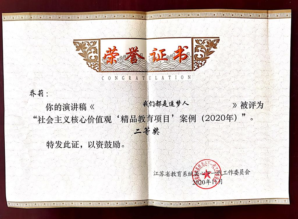 乔莉老师在“社会主义核心价值观‘精品教育项目’案例”评比中获二等奖